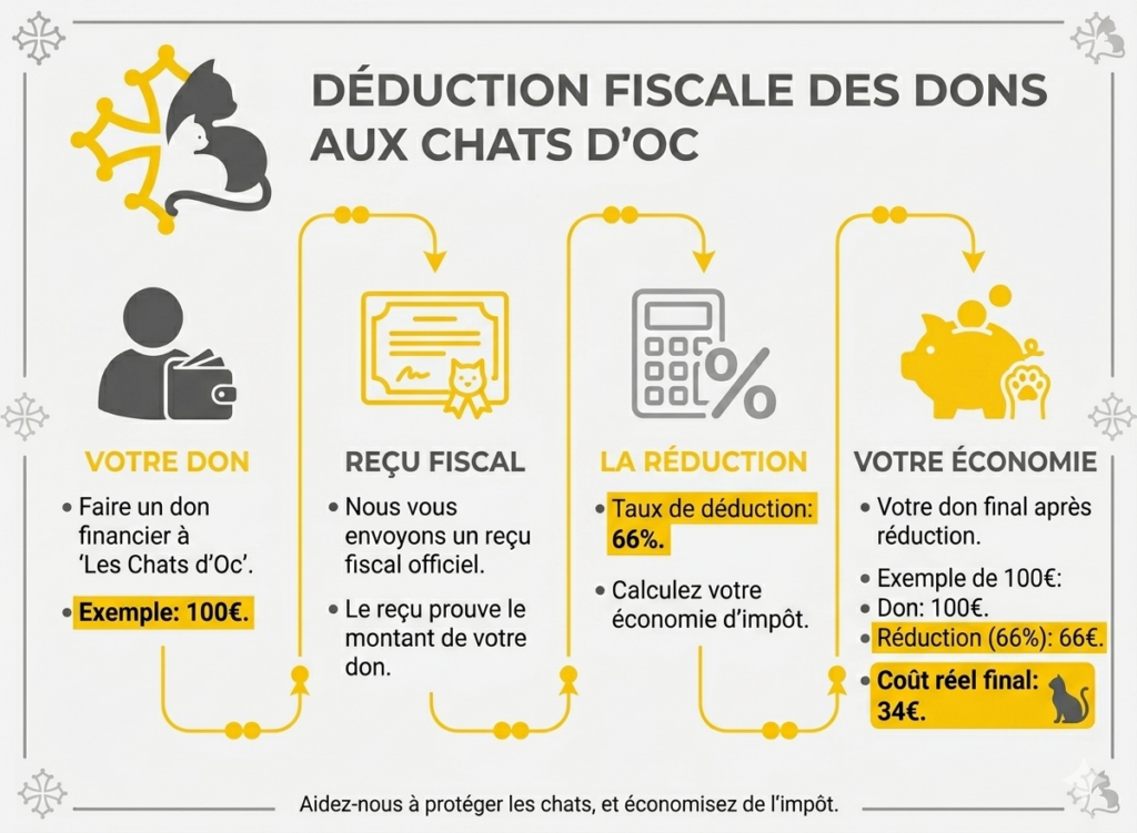Chaque don contribue directement à la protection, aux soins et au bien-être des chats pris en charge par l’association. Un reçu fiscal vous sera délivré sur demande.